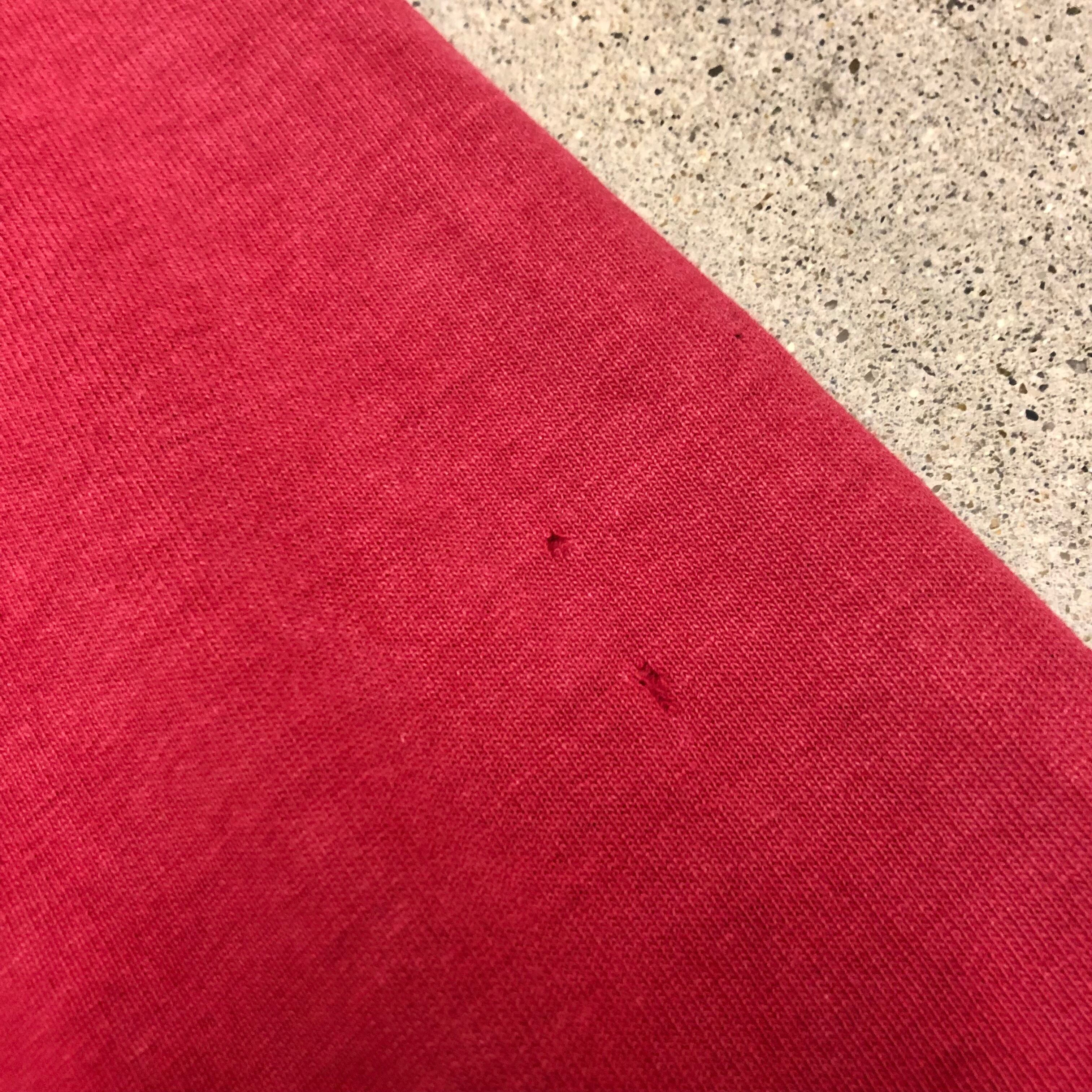 中古、古着特有の着用感、左袖、背タグ裏にピンホールがあります。