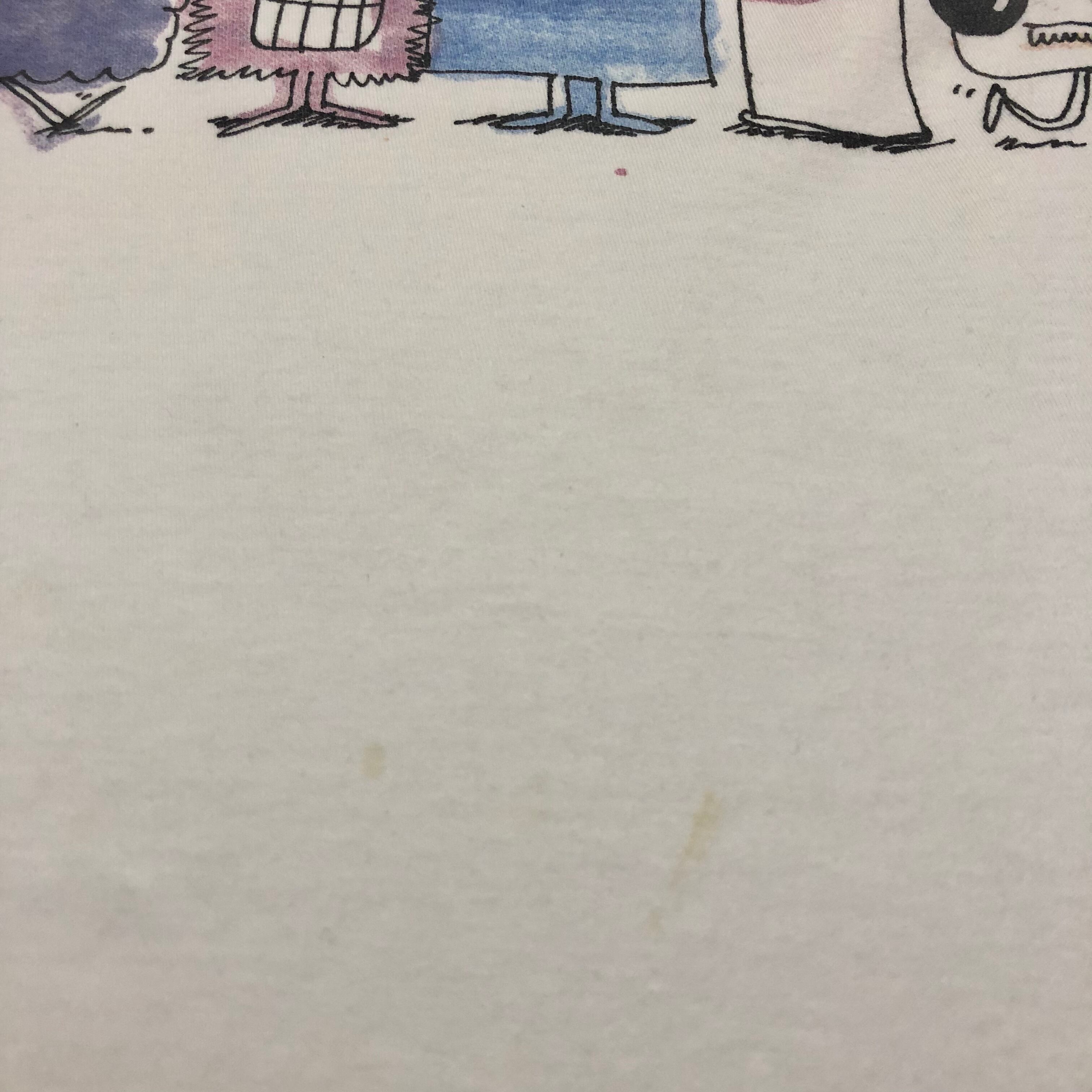 中古、古着特有の着用感があり、首周りに細かいダメージ、プリント下部分にシミがあります。