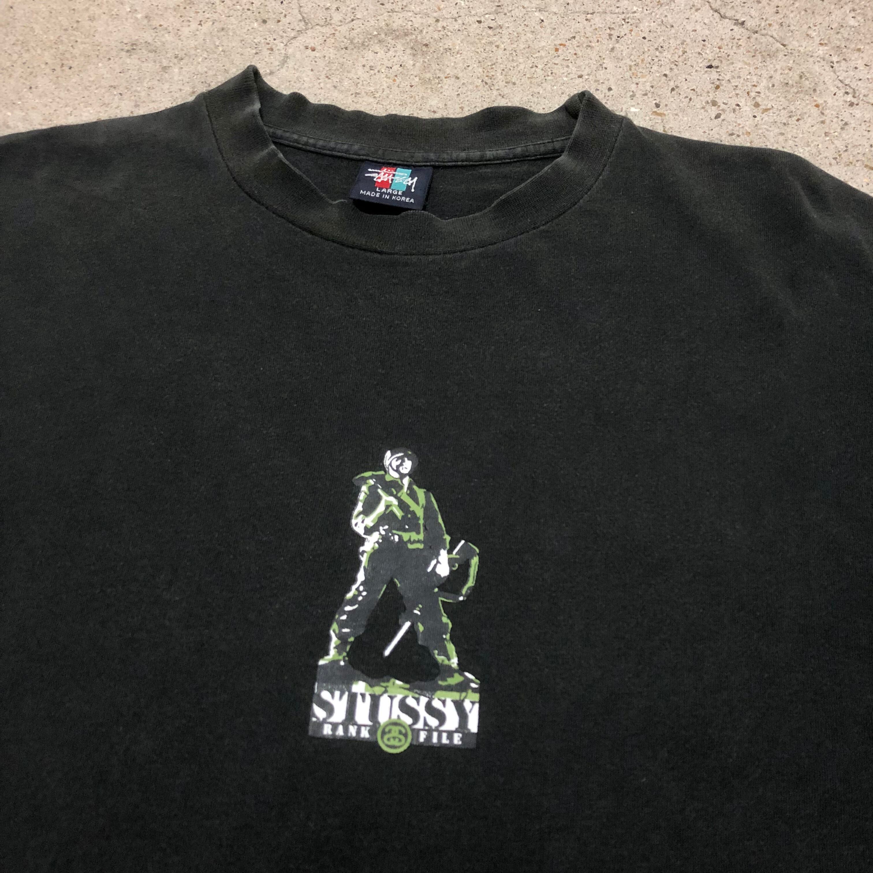 90s~Bootleg OLD STUSSY/RANK FILM Tee/Korea製/赤青タグ/L/ソルジャープリント/Tシャツ/ブラック/ステューシー/オールドステューシー