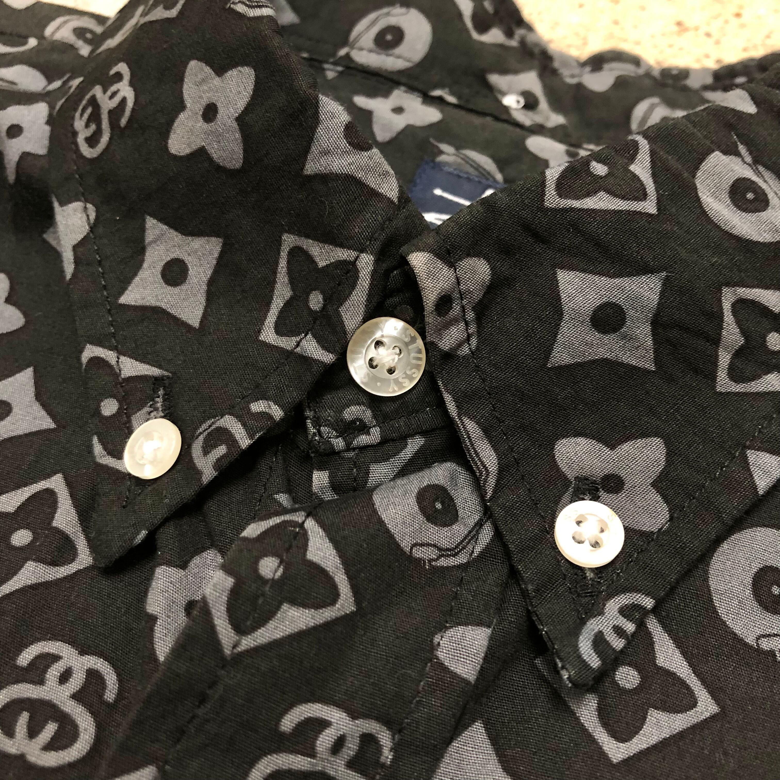 0s OLD STUSSY/Monogram s/s shirt/USA製/紺タグ/L相当/モノグラム/総柄/ボタンダウンシャツ/半袖/ブラック/グレー/ステューシー/オールドステューシー/古着/ヴィンテージ/アーカイブ