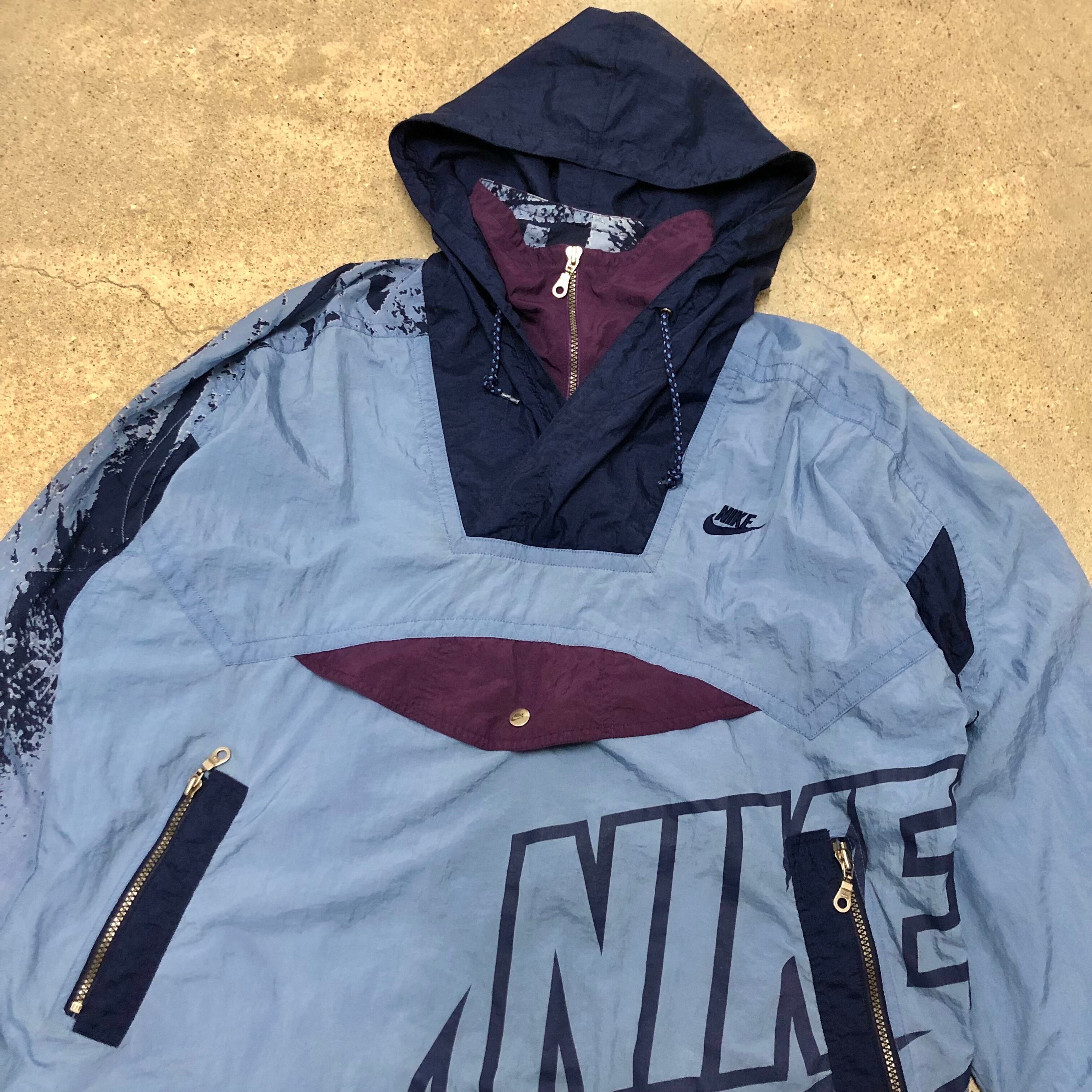 90s OLD NIKE/Anorak Nylon Hoodie/銀タグ/L/アノラックナイロンパーカー/ネイビー/総柄/ナイキ/オールドナイキ/古着/ヴィンテージ