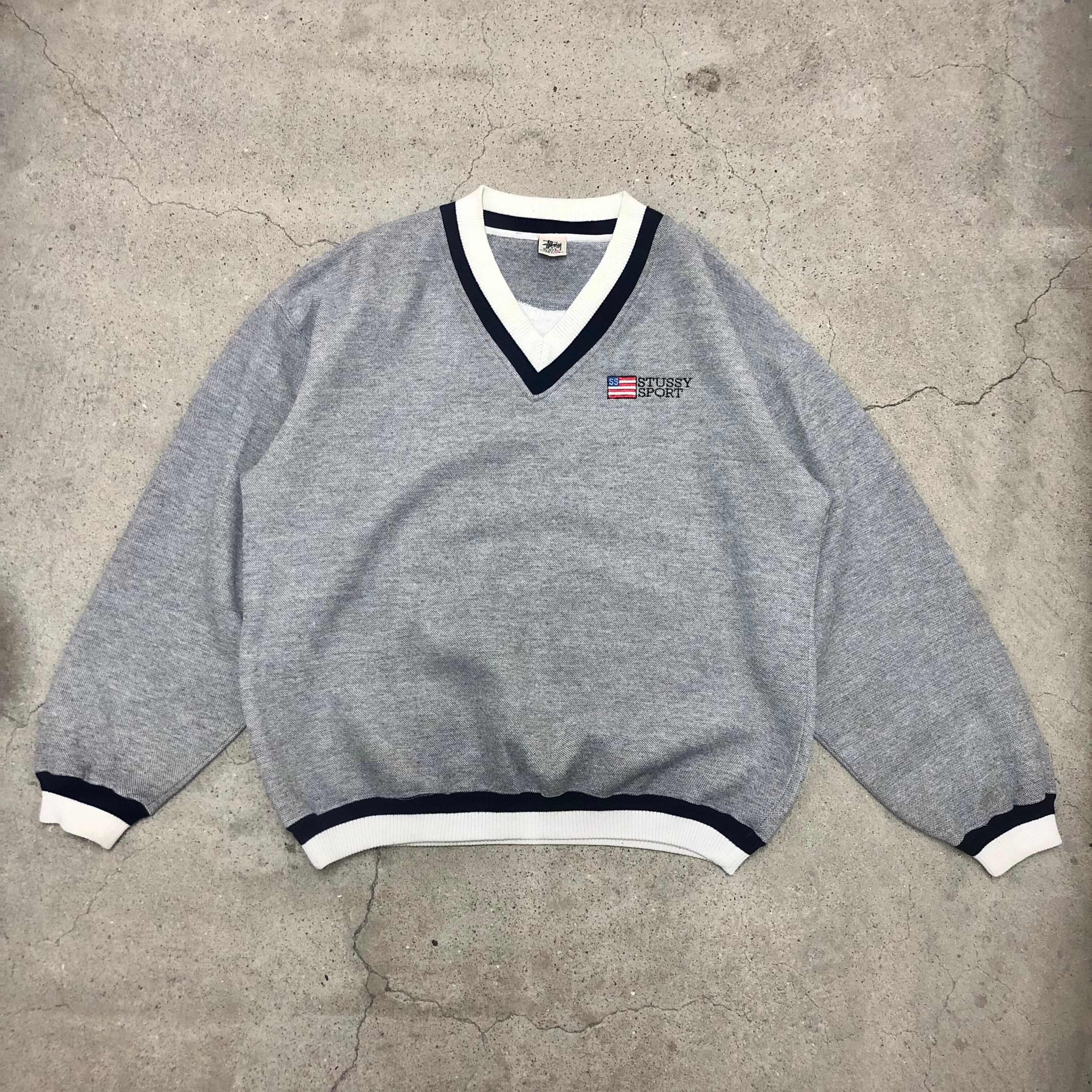 90s OLD STUSSY/STUSSY SPORT Logo V neck Sweat/USA製/白タグ/スウェット/刺繍ロゴ/グレー/ステューシー/オールドステューシー