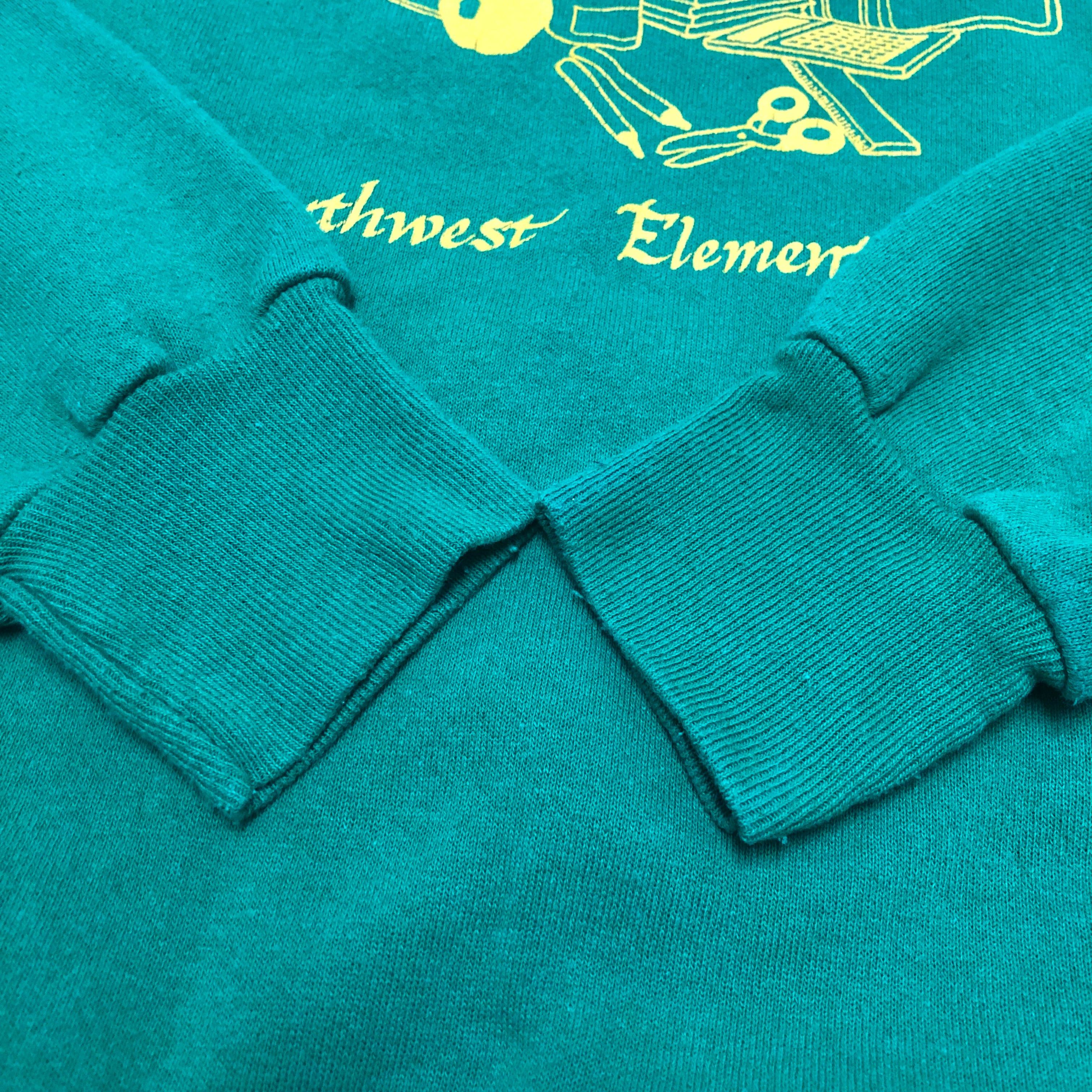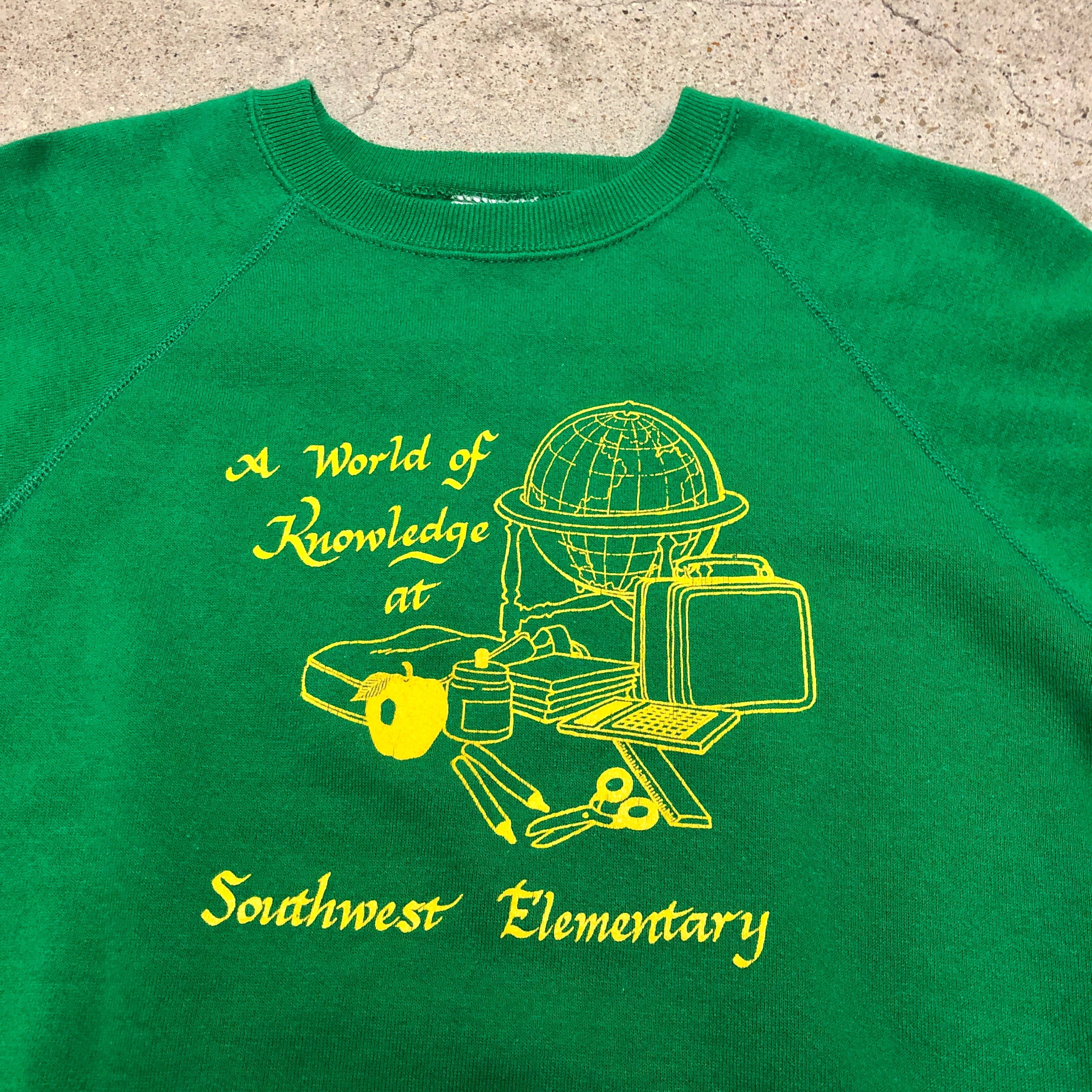 90s Lee/print sweat/USA製/XL/A World of knowledge at Southwest Elementary/プリントスウェット/ラグラン/グリーン/リー/アメカジ/古着/ヴィンテージ