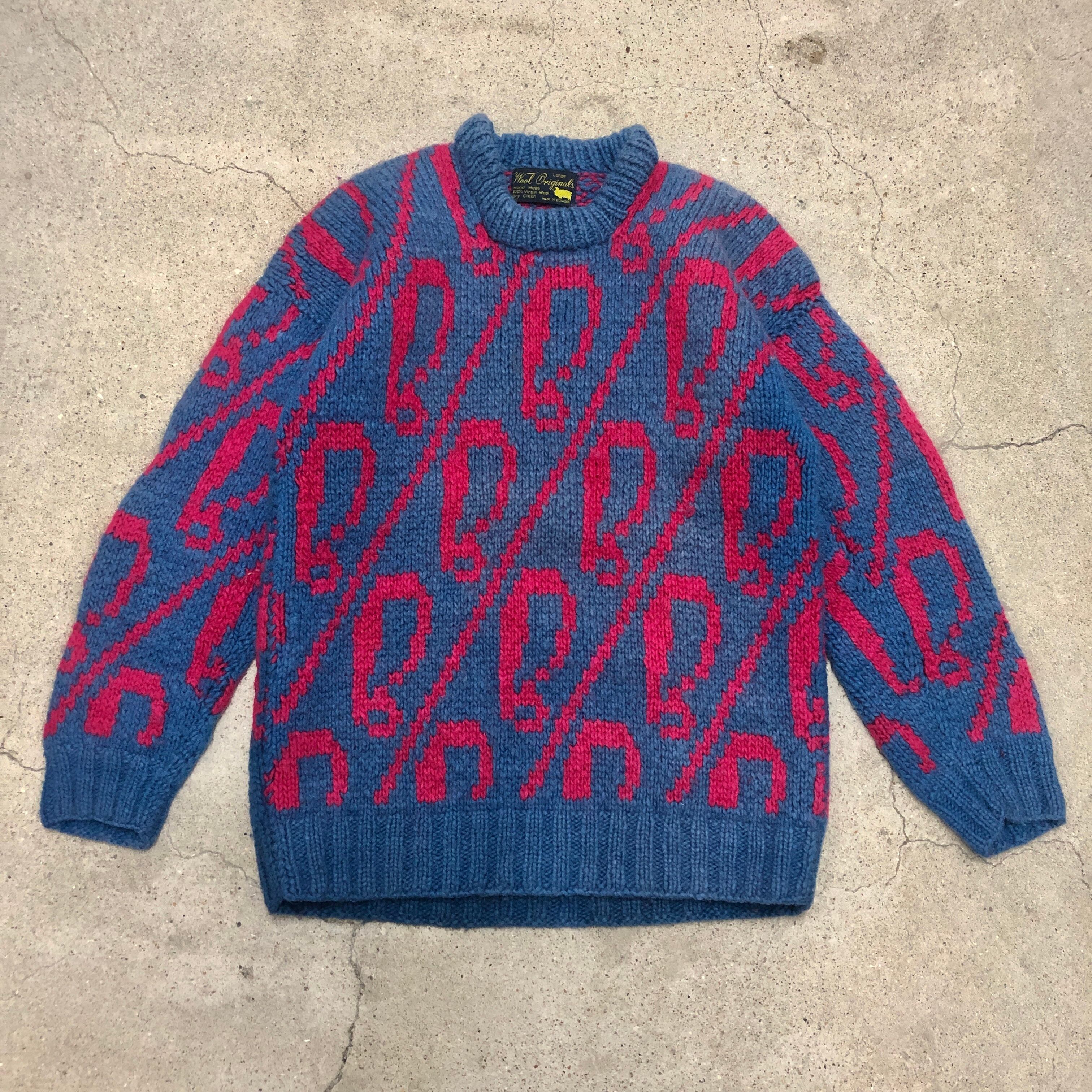 Ecuador Knit/Wool originals/L/!マークデザイン/エクアドルニット/セーター/Hand made/ネイビー/ピンク/エクアドル製/古着/ヴィンテージ