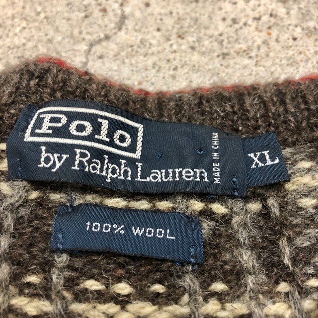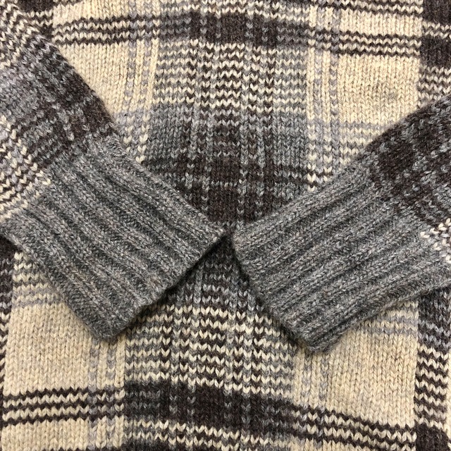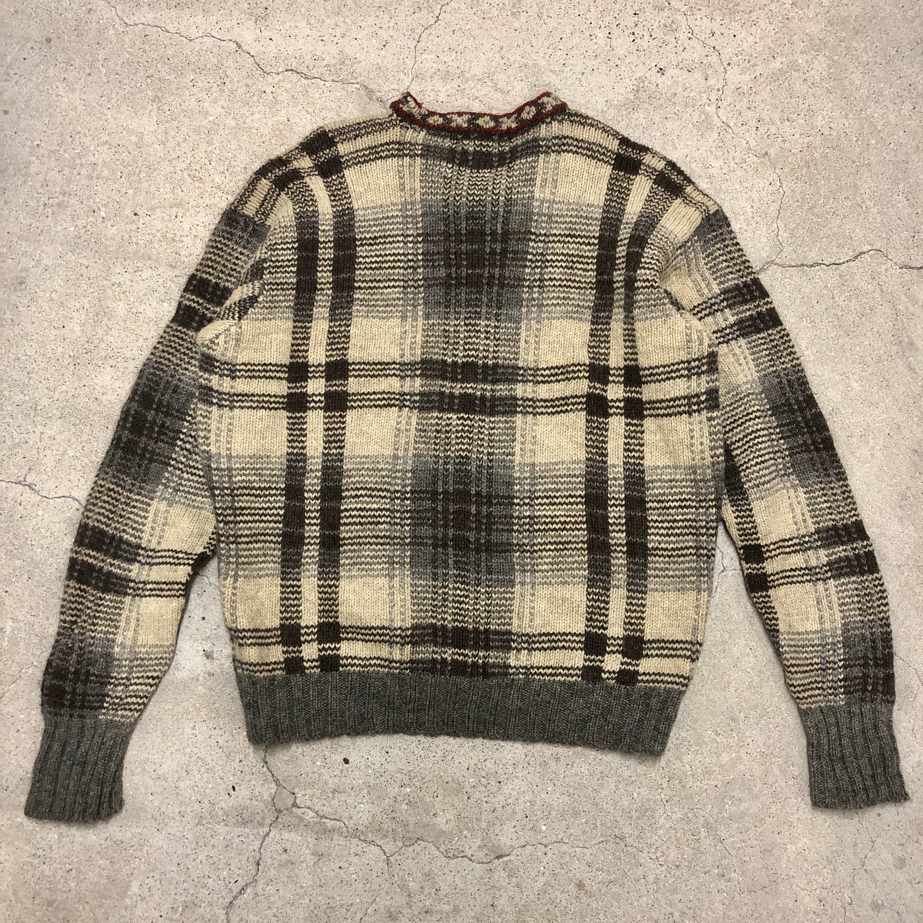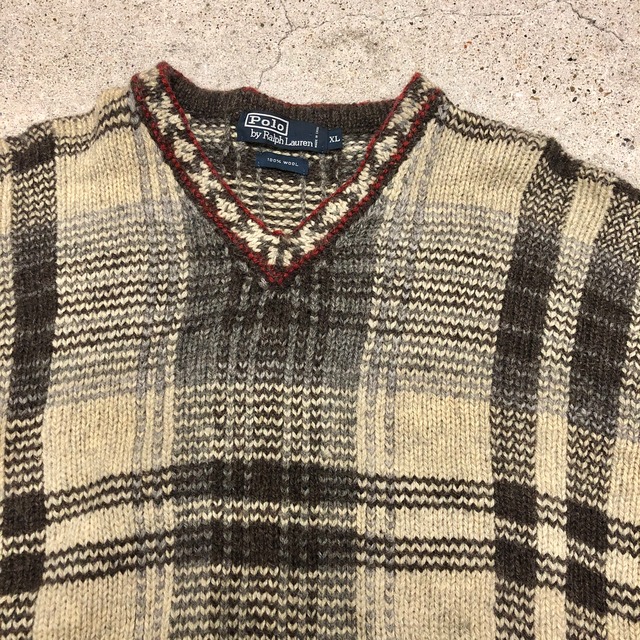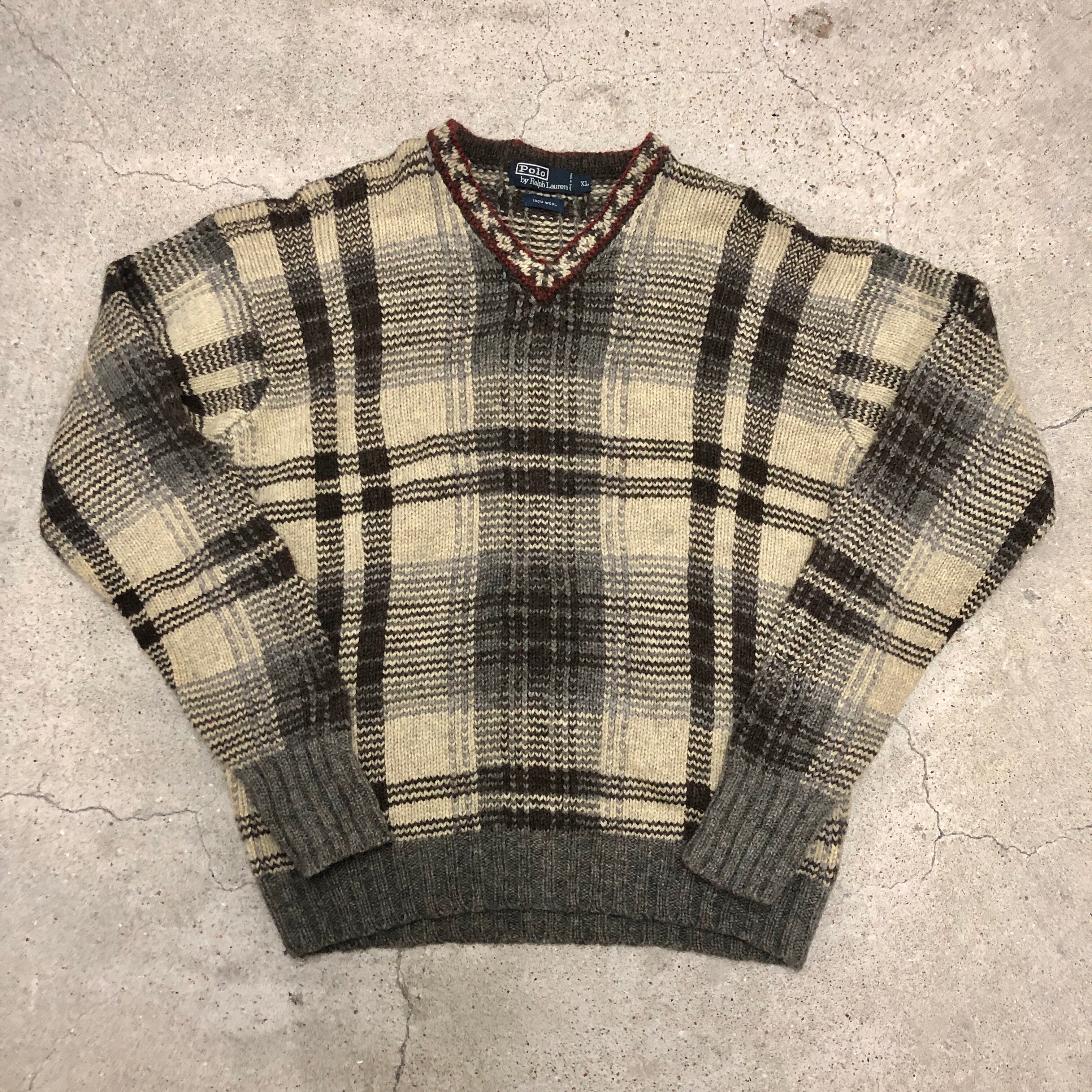 90~00s POLO RALPH LAUREN/Check Knit Sweater/XL/Vネック/チェック柄ニットセーター/ベージュ/グレー/ポロラルフローレン/アメカジ/古着/ヴィンテージ