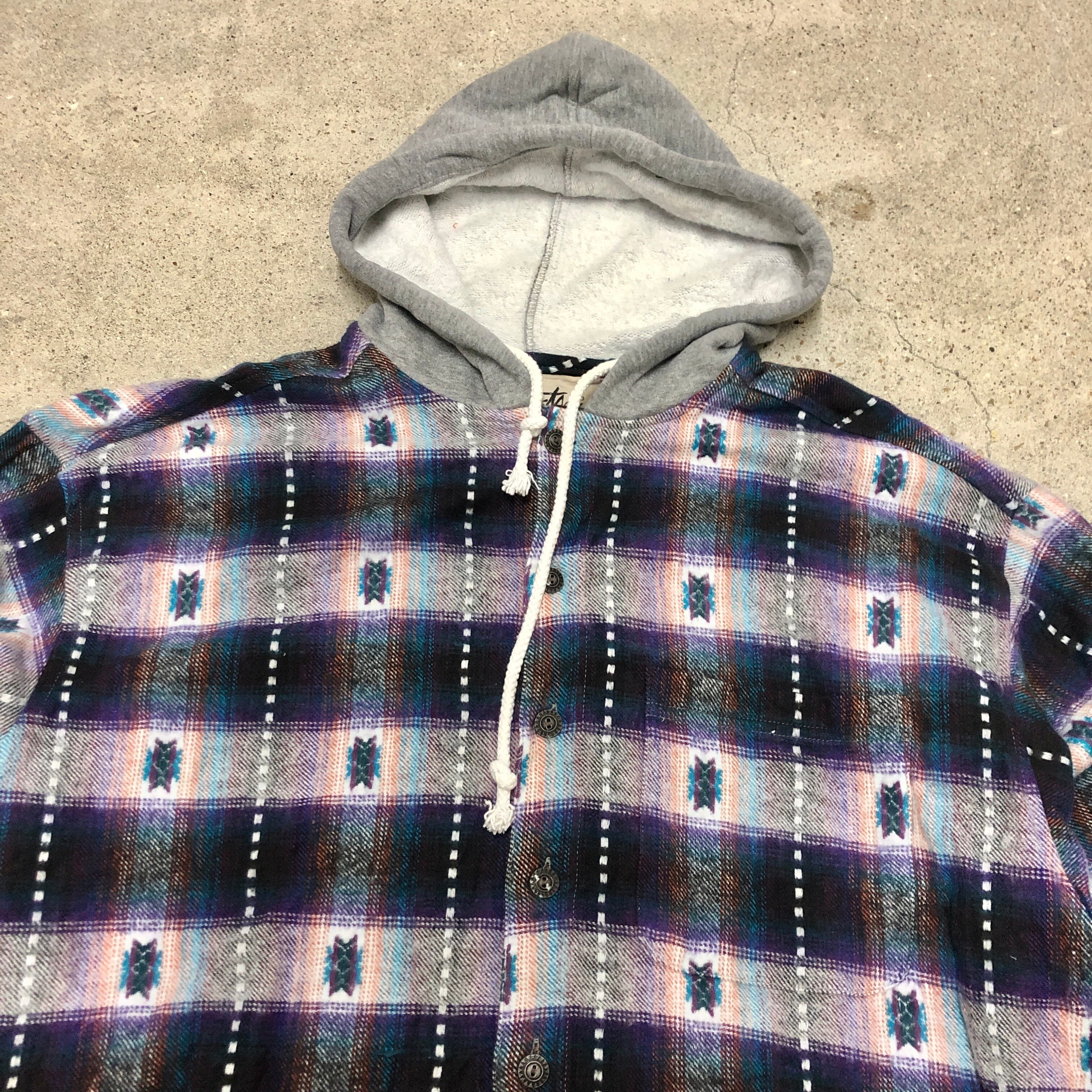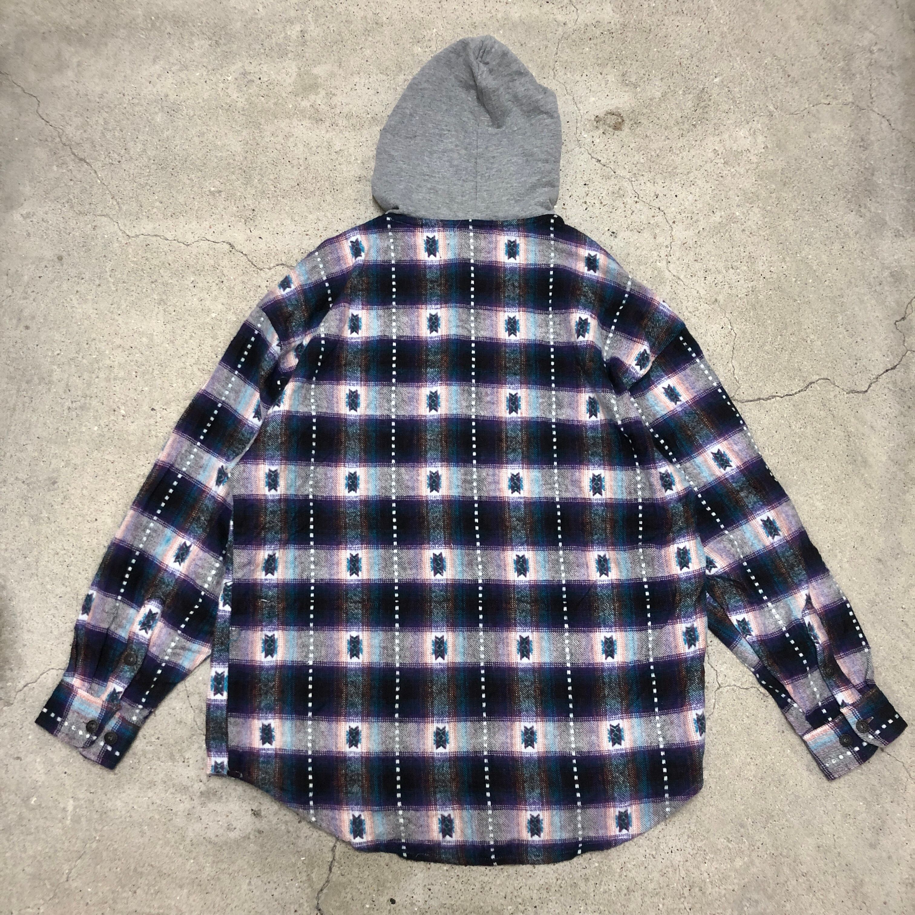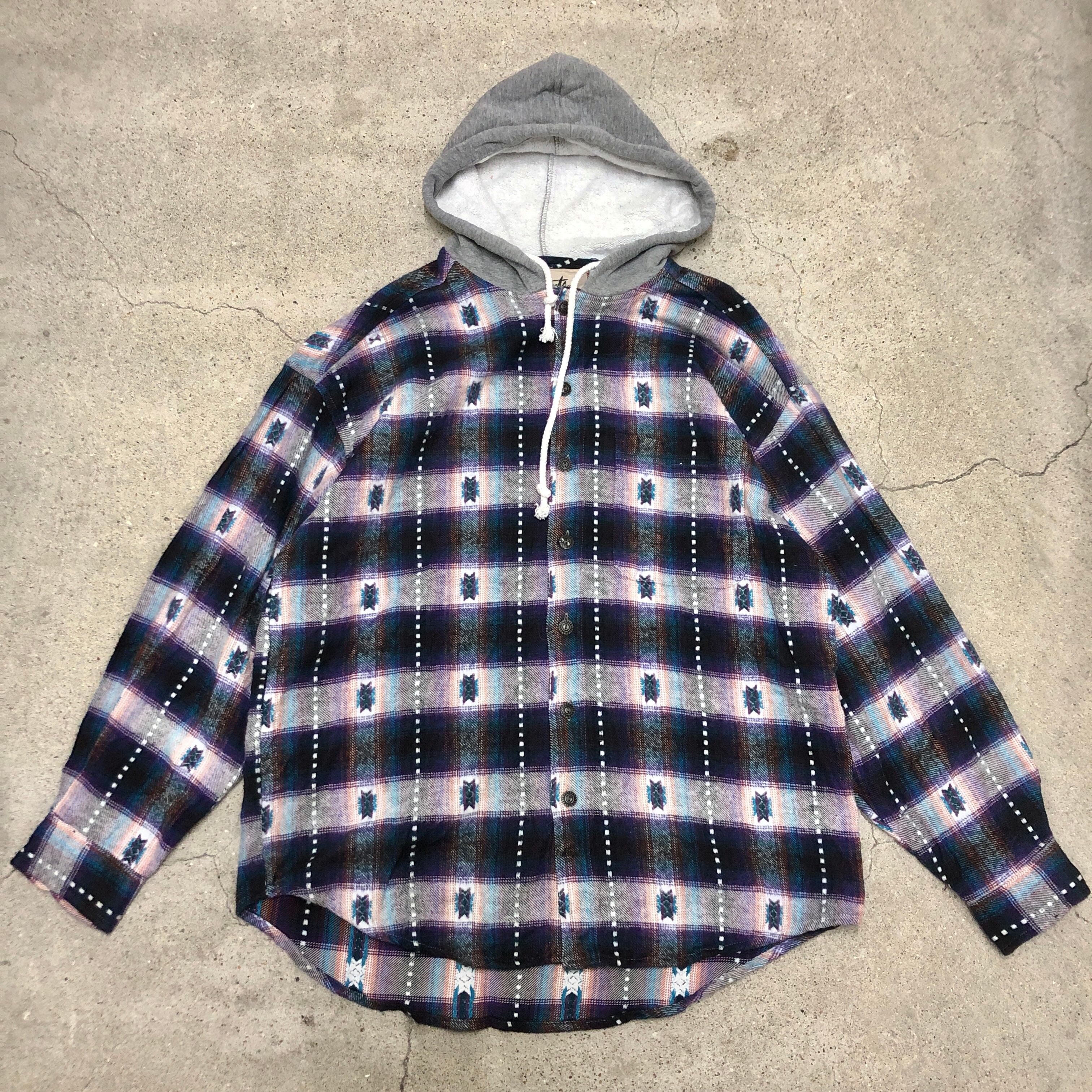 90~00s unknown/Hooded Flannel Shirt/M/フード付きネルシャツ/長袖シャツ/ネイビー/パープル/クウェート製