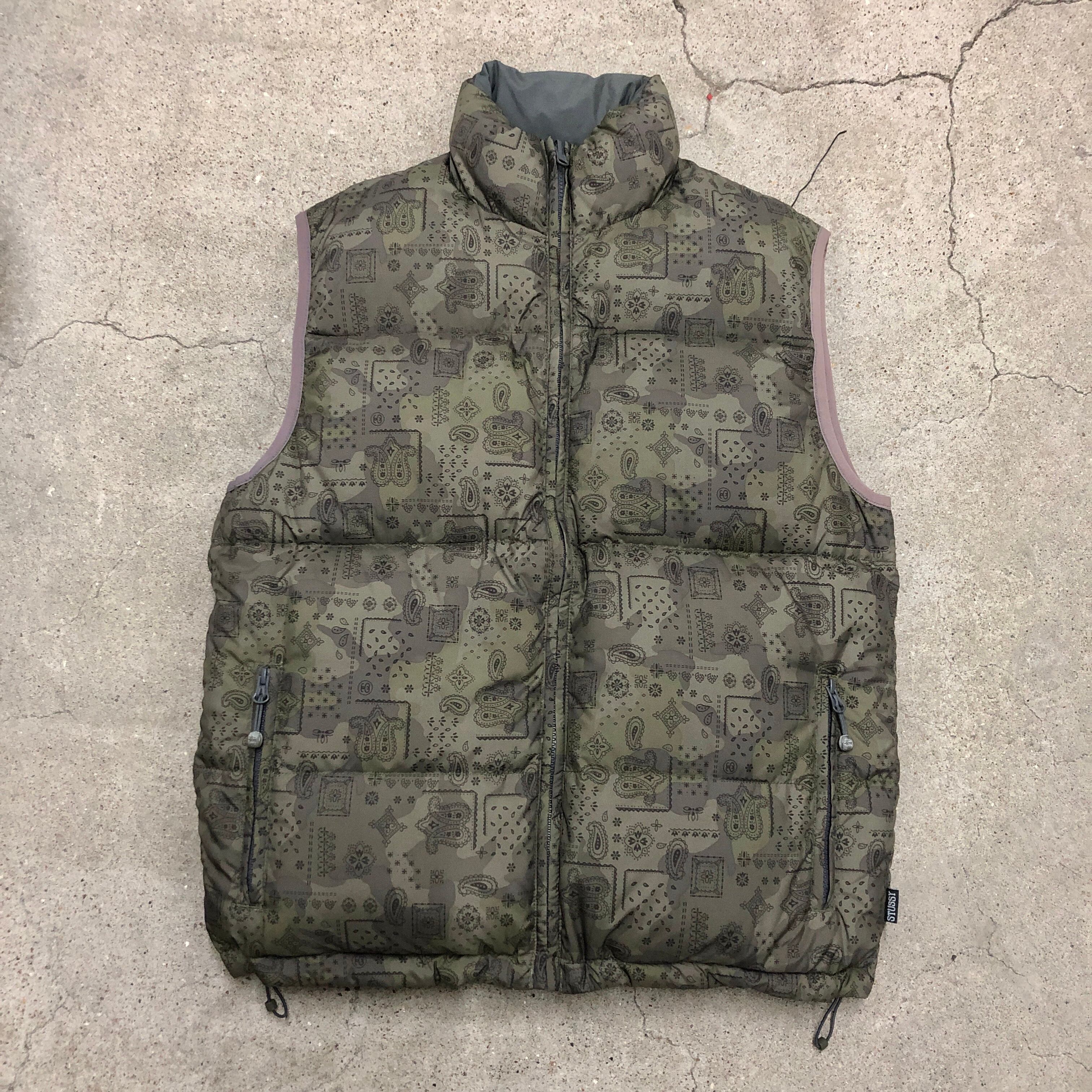 00s STUSSY/Paisley Reversible Down Vest/M/ペイズリー柄/リバーシブルダウンベスト/AUTHENTIC GEAR/カーキ/グレー/ステューシー/オールドステューシー