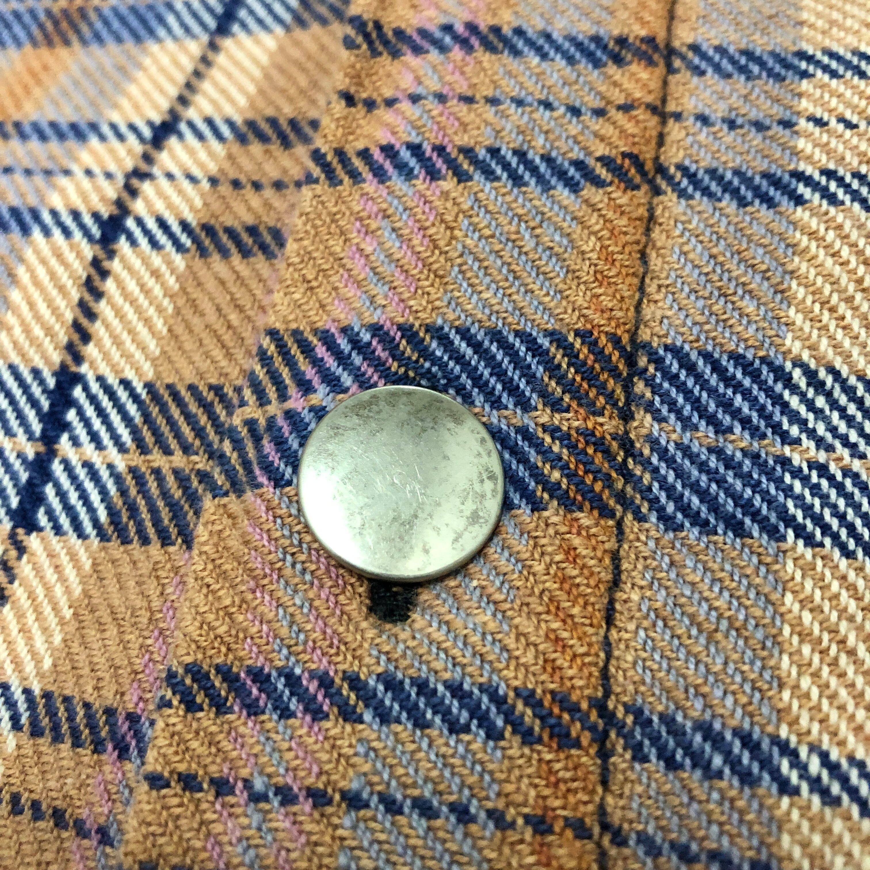 中古、古着特有の着用感があり、第6ボタン周辺にホツレがあります。