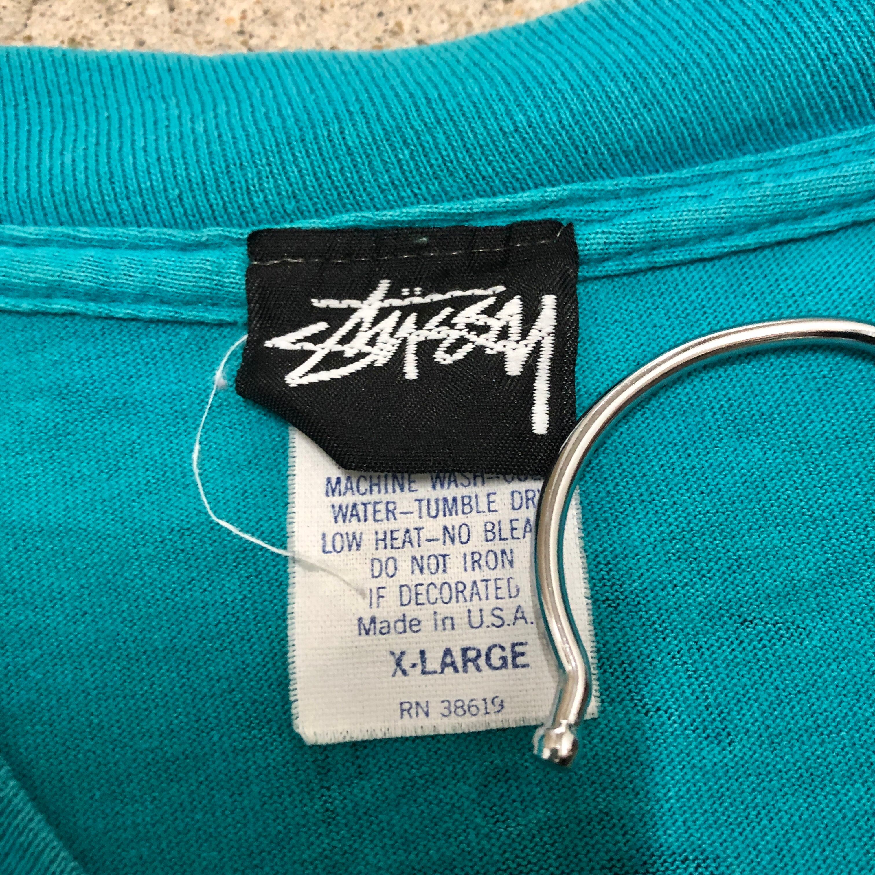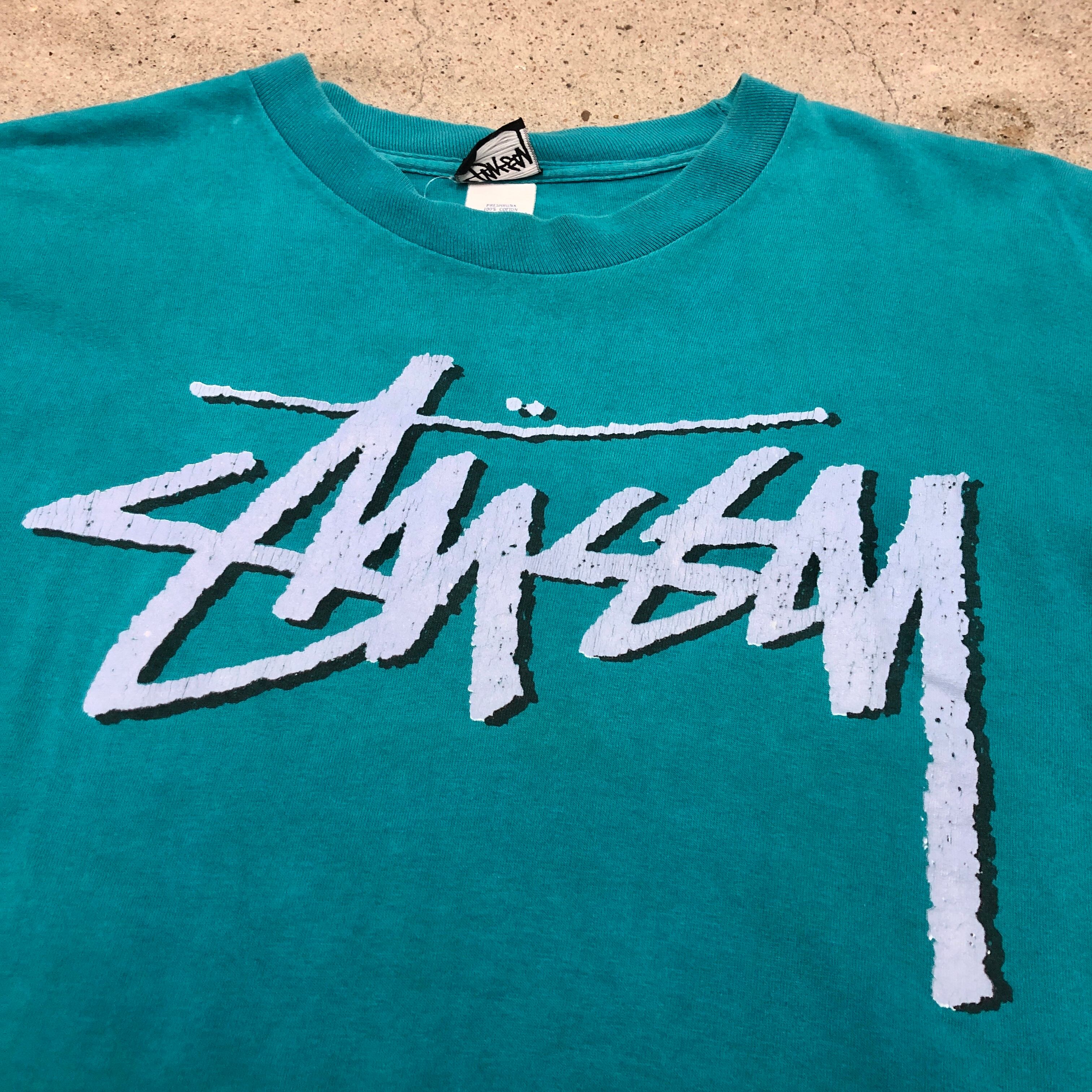 80s OLD STUSSY/Stock Logo print Tee/USA製/黒タグ/2枚タグ/XL/ストックロゴプリント/Tシャツ/サーフマンロゴ/ターコイズブルー/ステューシー/オールドステューシー/古着/ヴィンテージ/アーカイブ