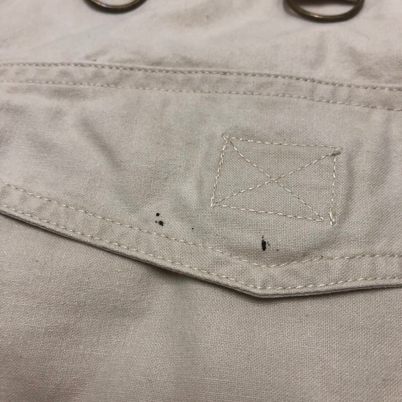 中古、古着特有の着用感があり、左ポケット、背中にシミがあります。