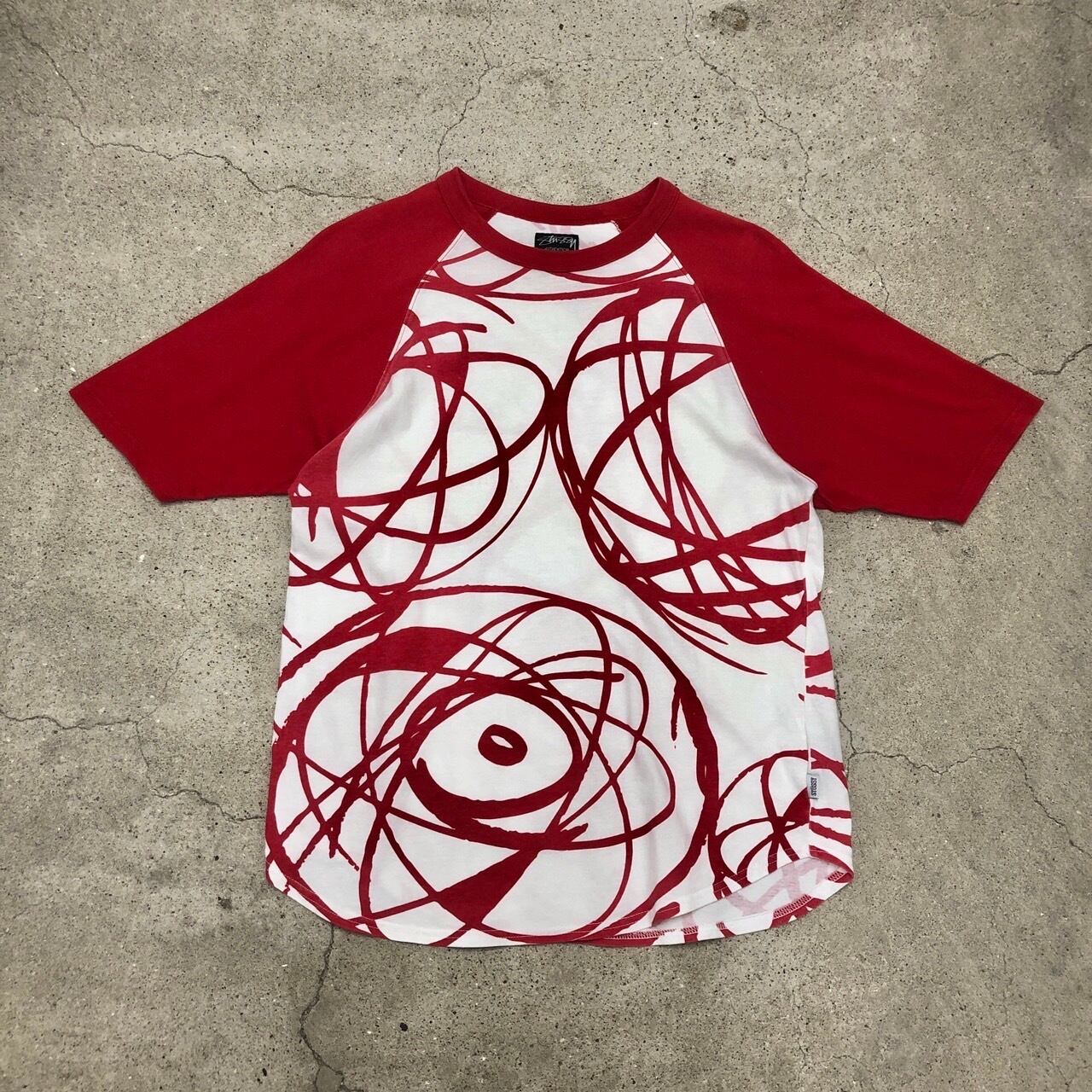 00s STUSSY × FUTURA/Raglan Tee/S/アトミックサークルプリント/ラグランT/Tシャツ/ホワイト/レッド/フューチュラコラボ/ステューシー/オールドステューシー