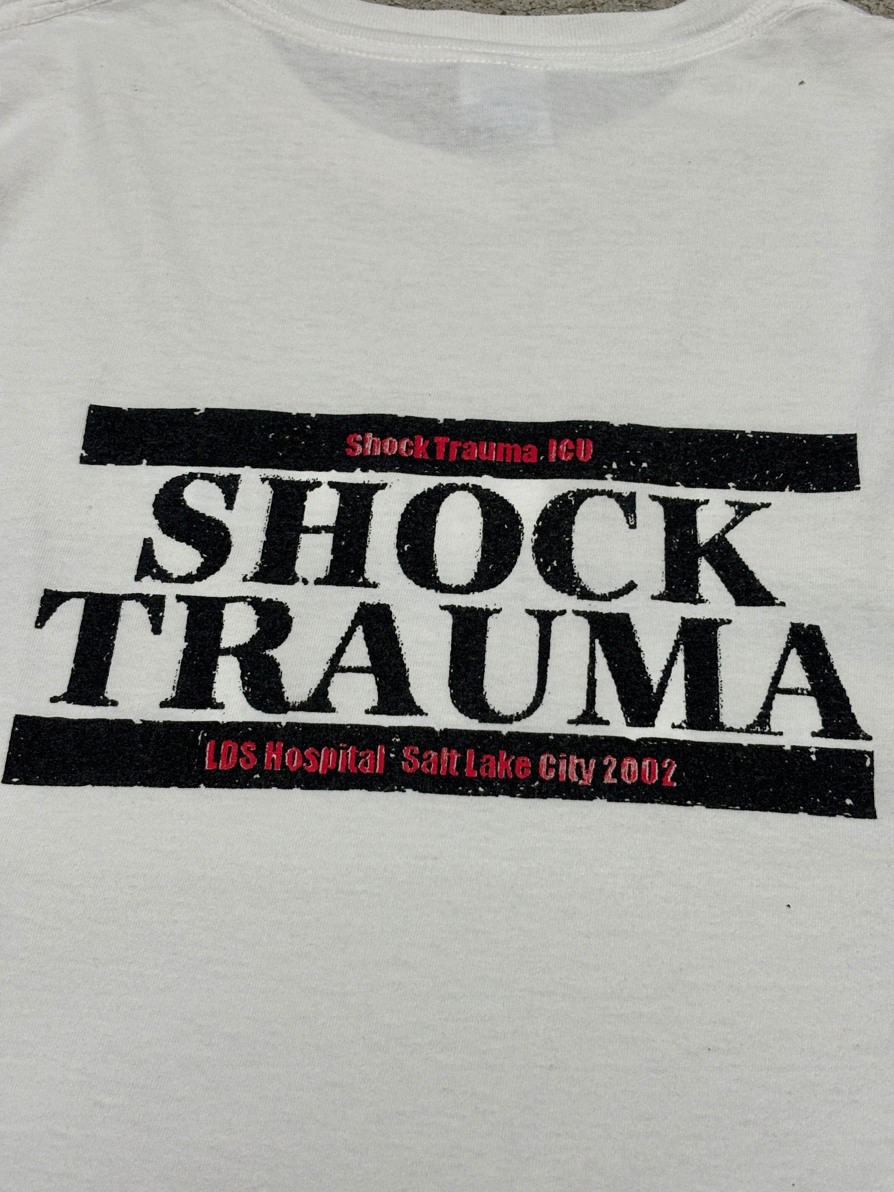 SHOCK TRAUMA ICU print Tee/L/ショック外傷集中治療室プリントT/Tシャツ/ホワイト/病院/企業/古着/GILDAN/2002年