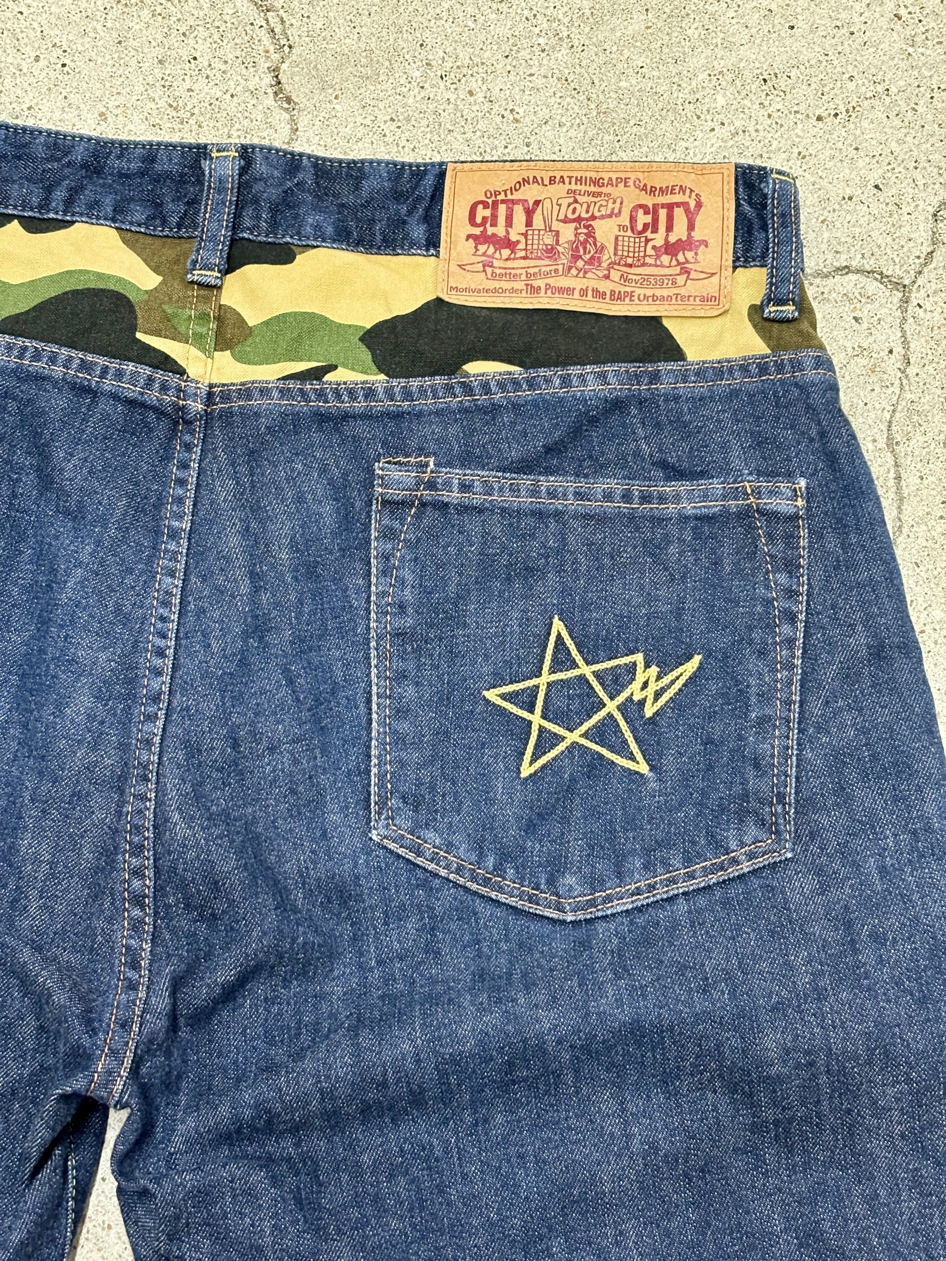 A BATHING APE/BAPSTA Embroidery Denim Shorts/M/ベイプスタ刺繍/デニムショーツ/ショートパンツ/インディゴ/カモフラ/アベイシングエイプ
