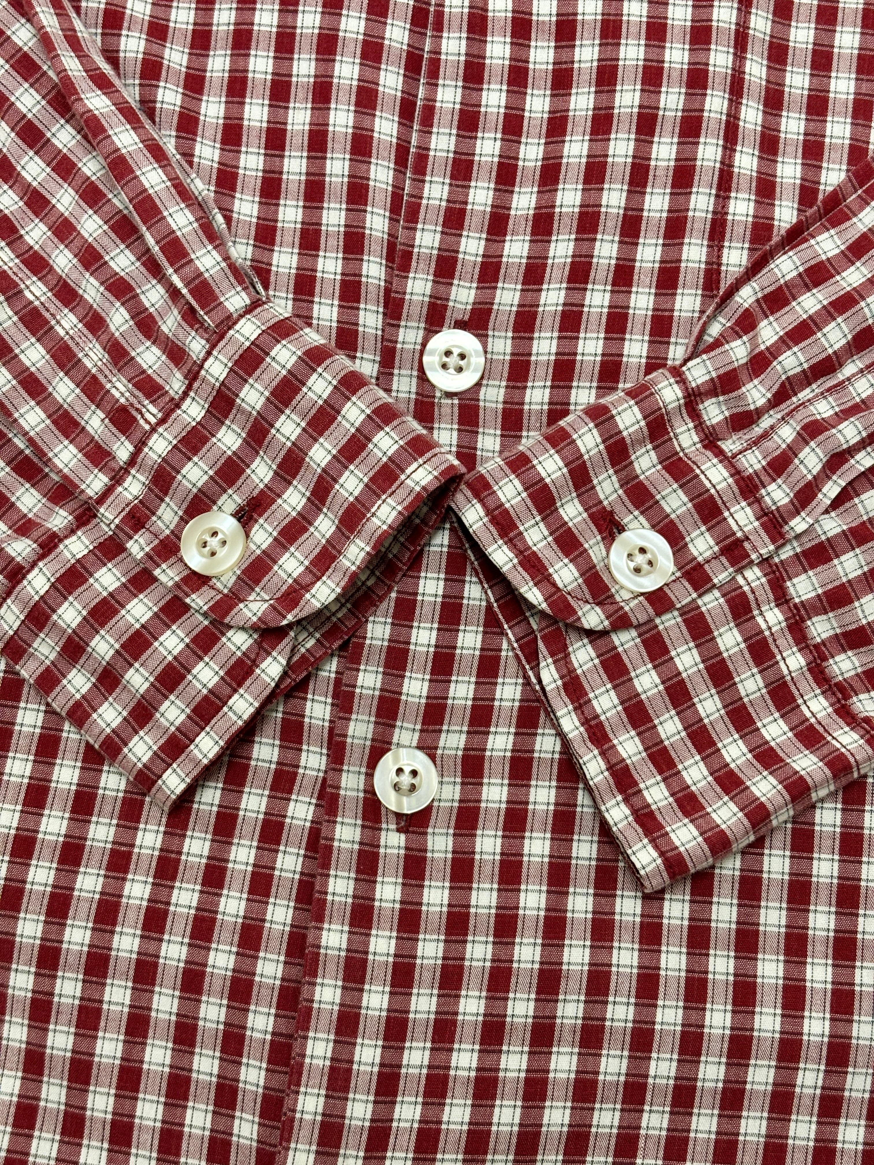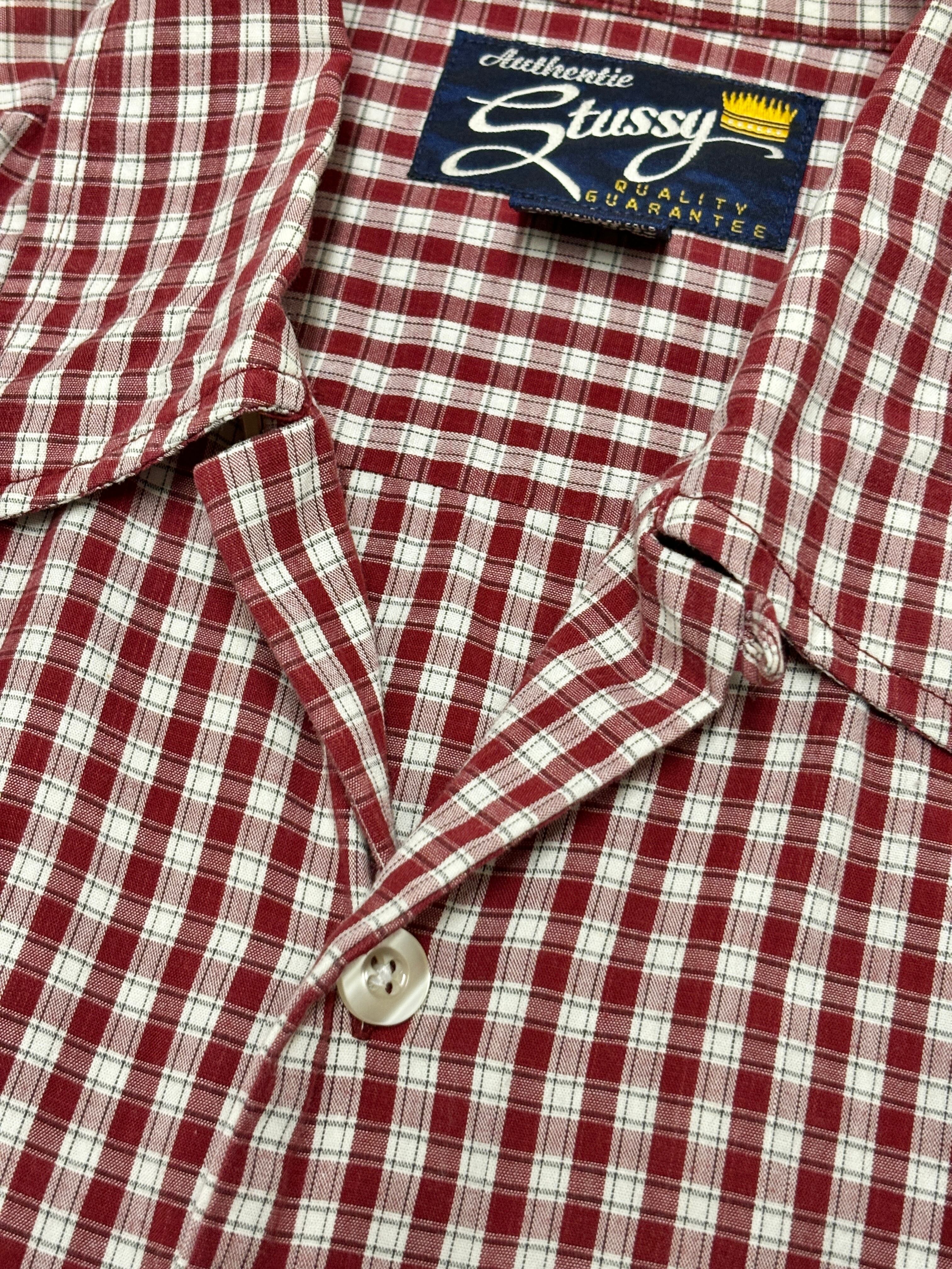 90~00s OLD STUSSY/Check Open collar Shirt/紺タグ/S/ギンガムチェック柄/オープンカラーシャツ/長袖シャツ/SSリンクロゴ/刺繍ロゴ/レッド/ホワイト/ステューシー/オールドステューシー