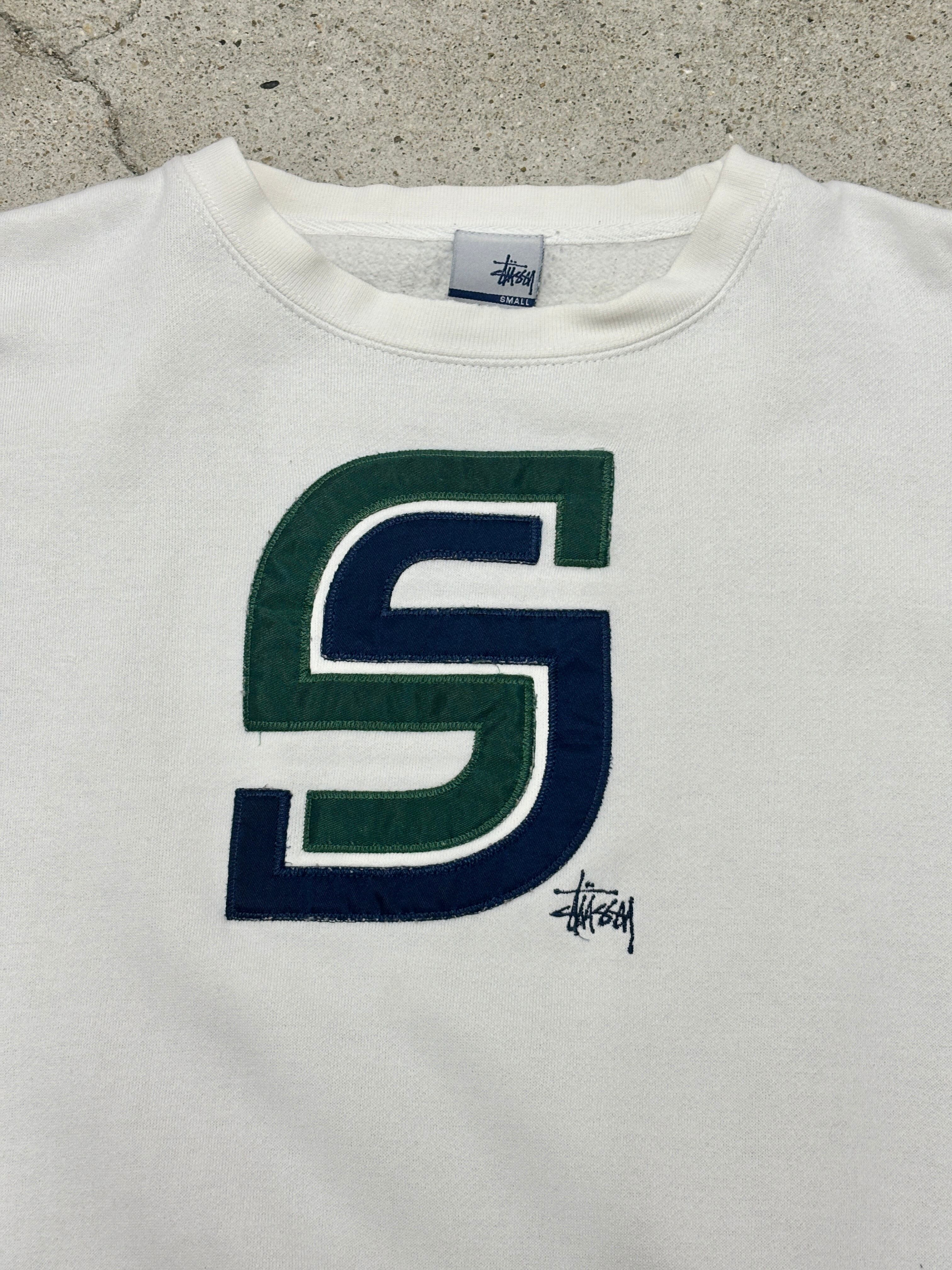 00s OLD STUSSY/Logo patch Sweat/USA製/銀タグ/S/ロゴパッチ/刺繍ロゴ/スウェット/ストックロゴ/ホワイト/ステューシー/オ-ルドステューシー/古着/ア-カイブ