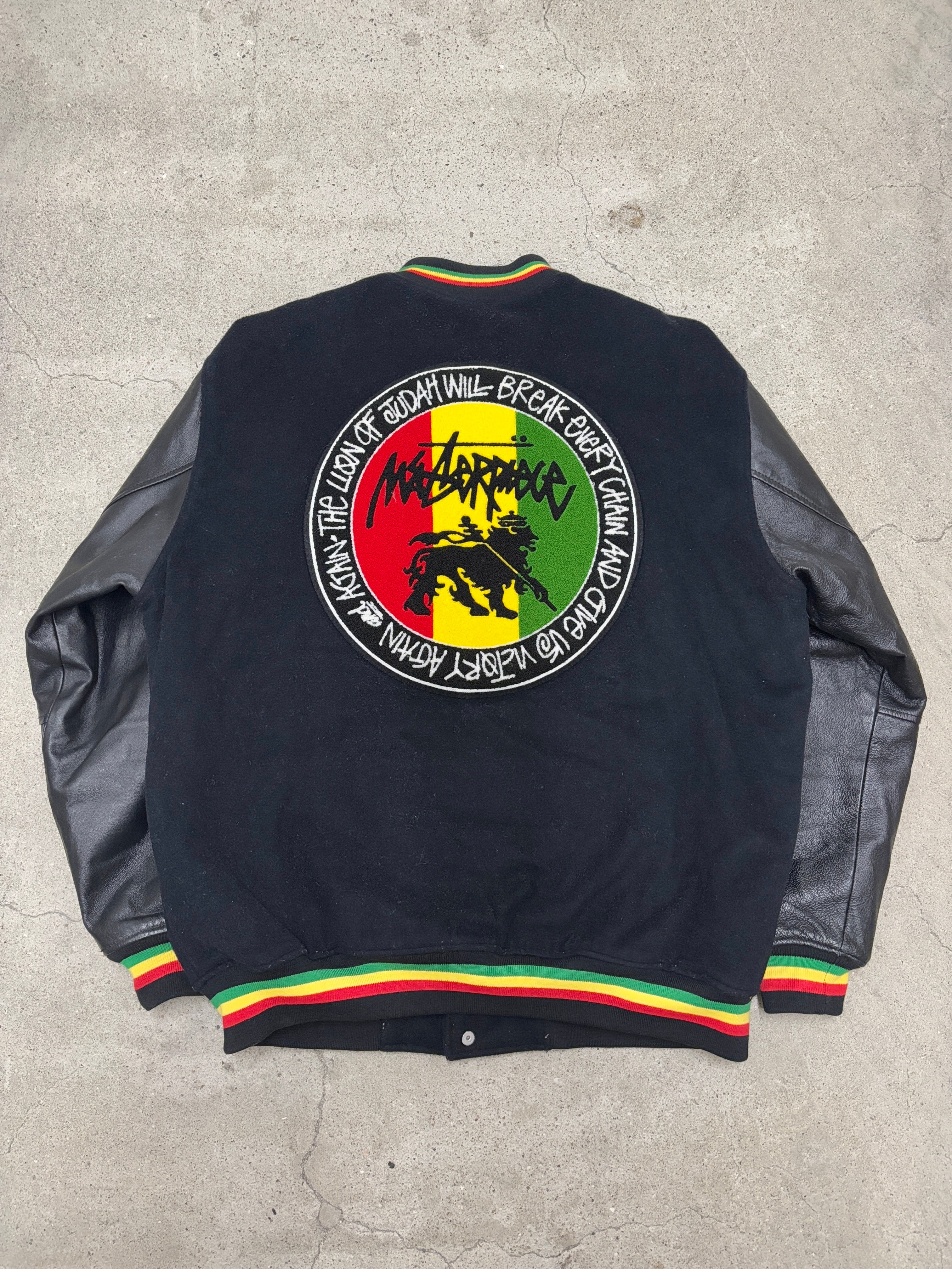 00s OLD STUSSY × MASTERPIECE/Varsity Jacket/2004年/XL/限定アイテム/スタジャン/ラスタアラ-/ロゴワッペン/ブラック/マスターピースコラボ/ステューシー/オ-ルドステューシー